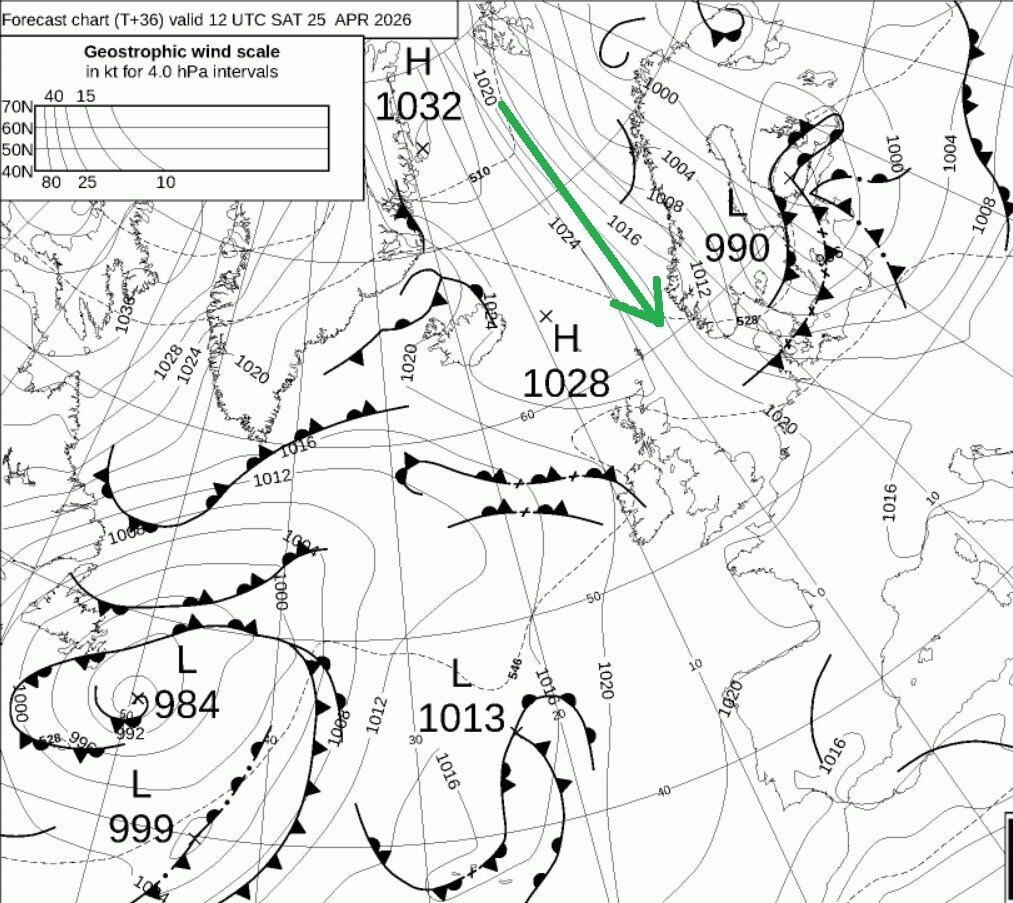 In het omcirkelde deel bij Engeland zou die swell van morgen (zaterdag) moeten afkomen.