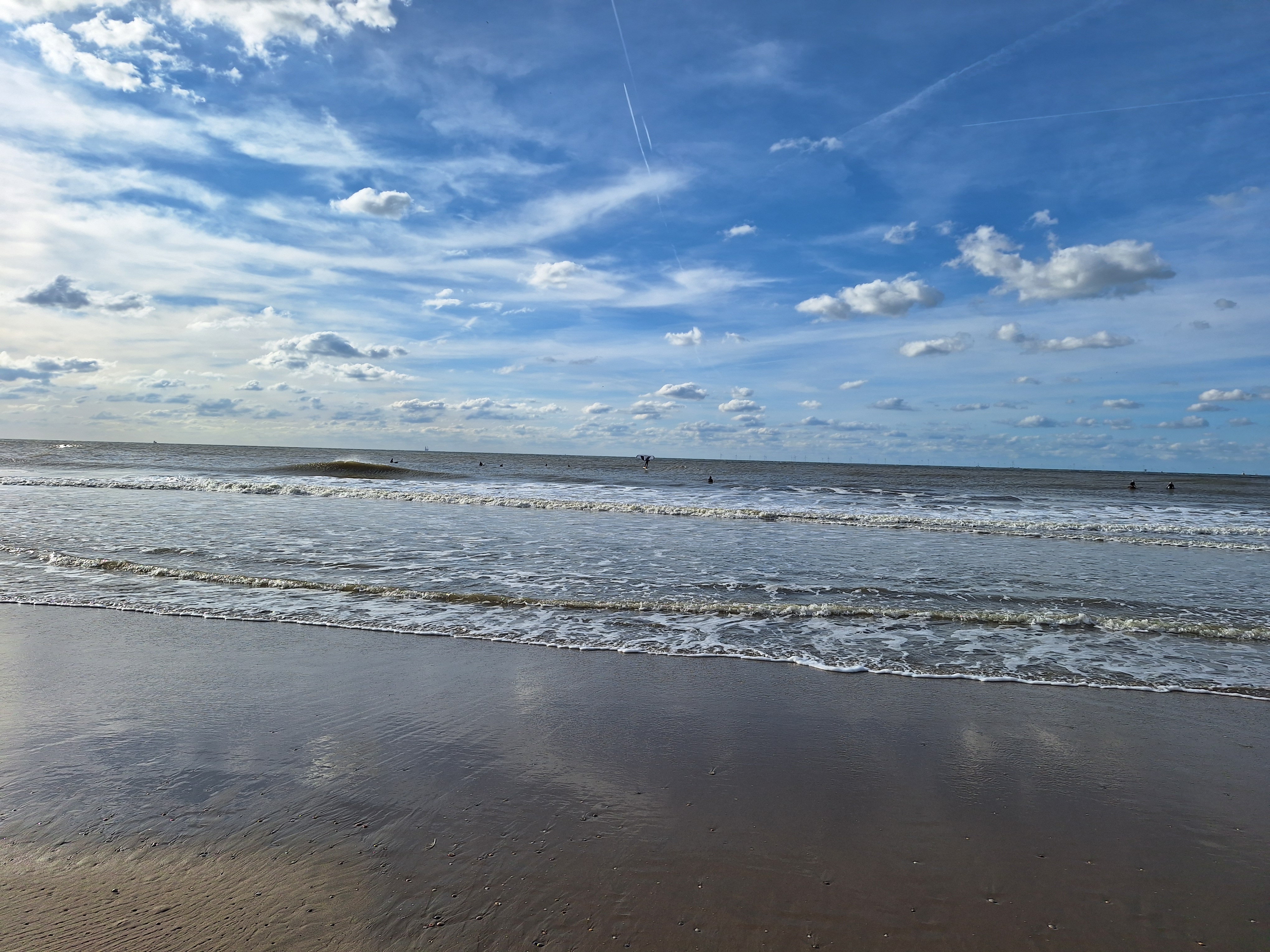 Wijk aan Zee gister begin van de middag was een branding van strand tot einde Noordpier, als je erin ging leek het wel alsof je alleen maar steeds hogere golven zag richting horizon, een soort dansend heuvellandschap. Werd af en toe liggend op mijn bord er vanaf gespoeld . Over golfhoogte ga ik me niet wagen maar alleen al het opstuiterend schuim van een omklappende golven was al anderhalve meter